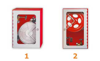 Armario de dimensiones mínimas para empotrar equipado con lanza, manguera y manómetro. Se une al carrete situado en una habitación contigua.